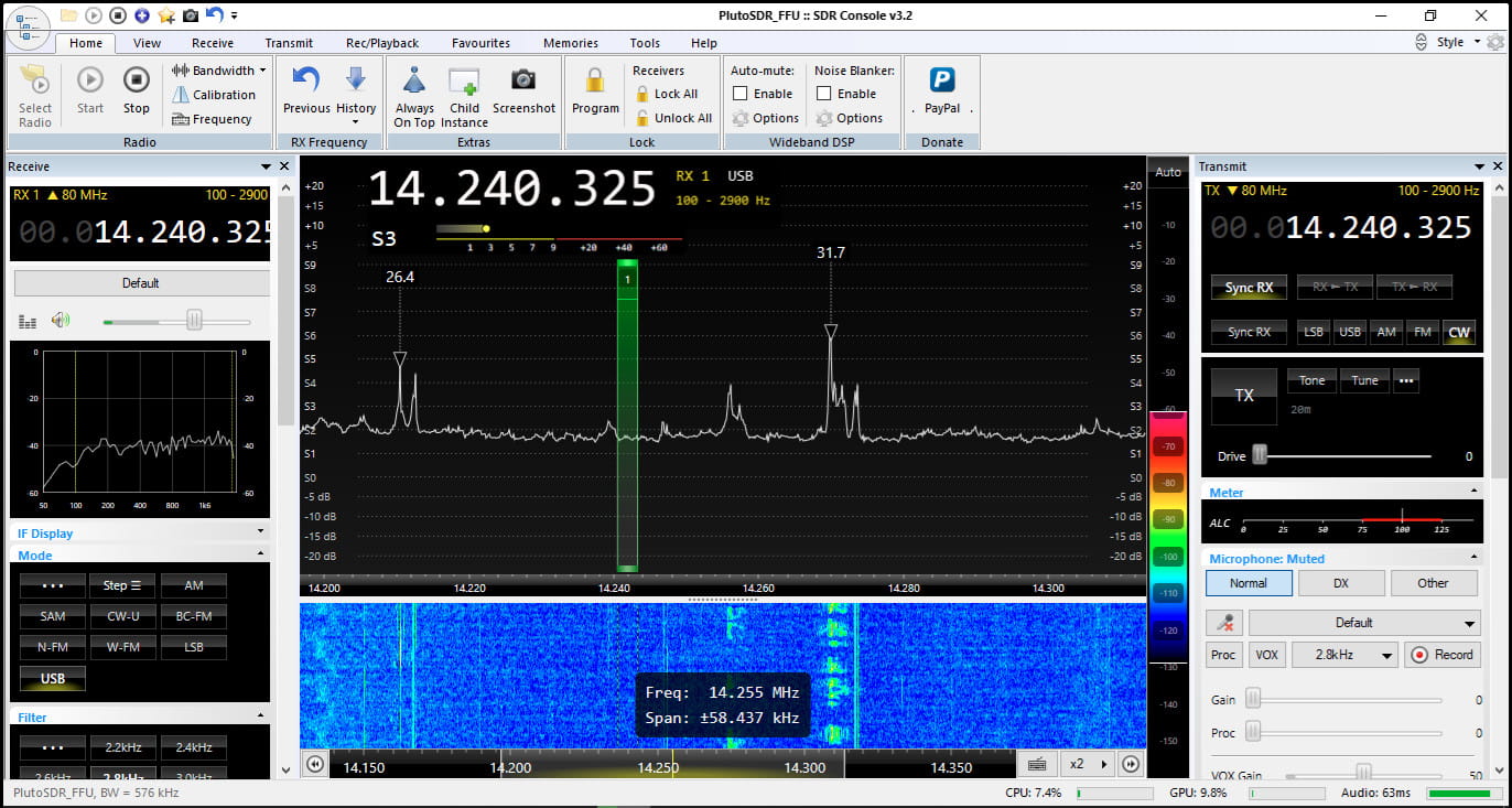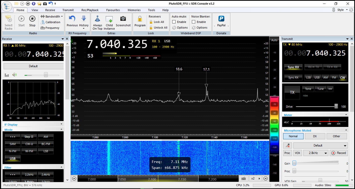 Świetnie współpracuje z oprogramowaniem SDR-Console V3, które zapewnia obsługę torów RX i TX oraz szerokopasmowy analizator widma pracujący w trybie rzeczywistym. Do tego posiada bardzo ładną oprawę graficzną oraz dużą funkcjonalność.