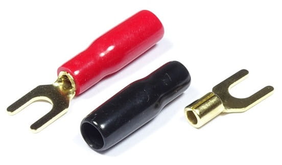 Złocone końcówki widełkowe do zakończenia kabli zasilających, pasujące do gniazd śrubowych i bananowych o średnicy 5mm.