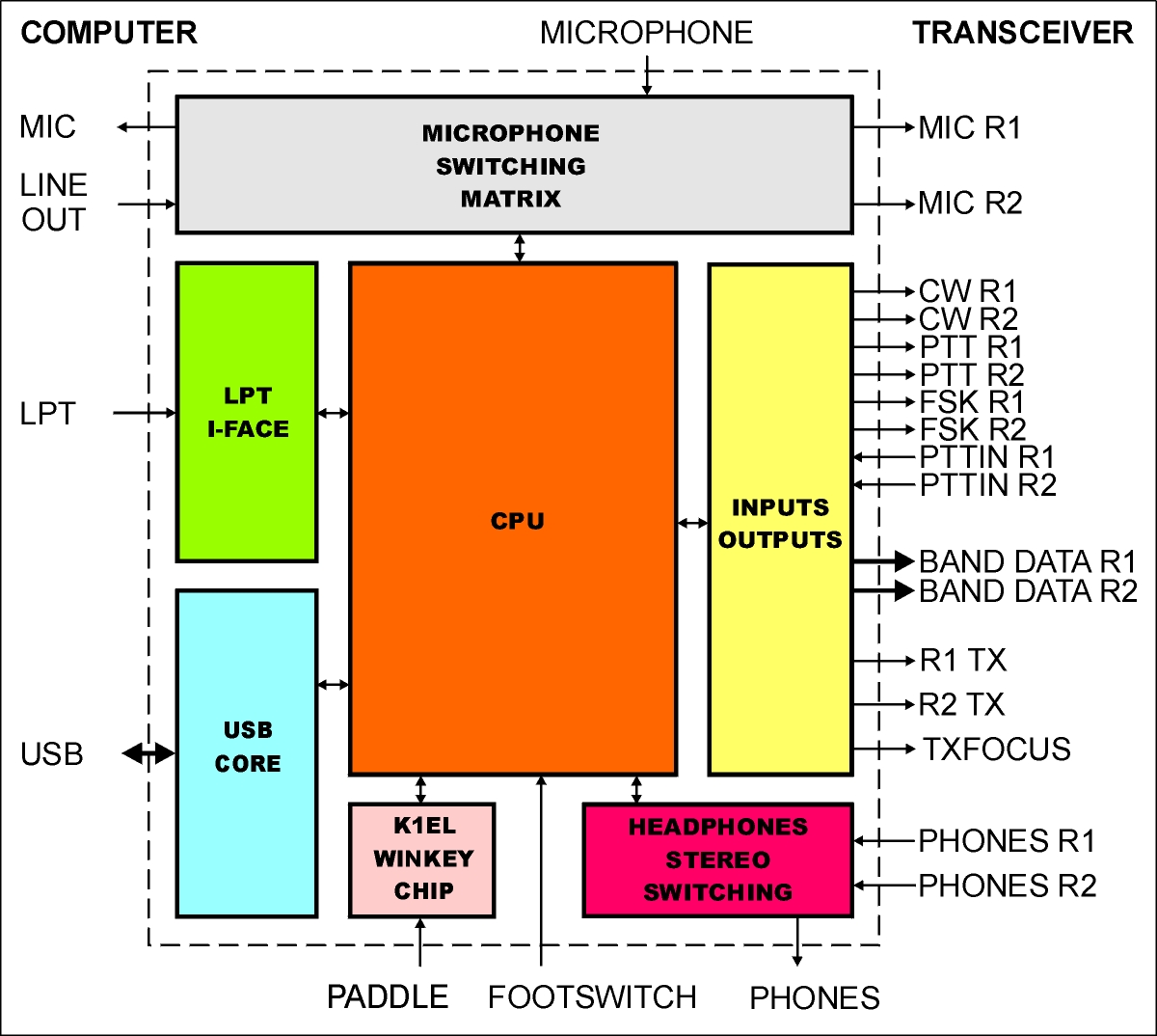Do obsługi SO2R u2R™ wykorzystuje sterowanie USB lub LPT, zawiera sprawdzony klucz CW WinKey, obsługuje mikrofony elektretowe i dynamiczne, port FSK zgodny z UART dla każdego radia oraz wbudowaną obsługę funkcji klucza głosowego najpopularniejszego oprogramowania do pracy w zawodach KF.