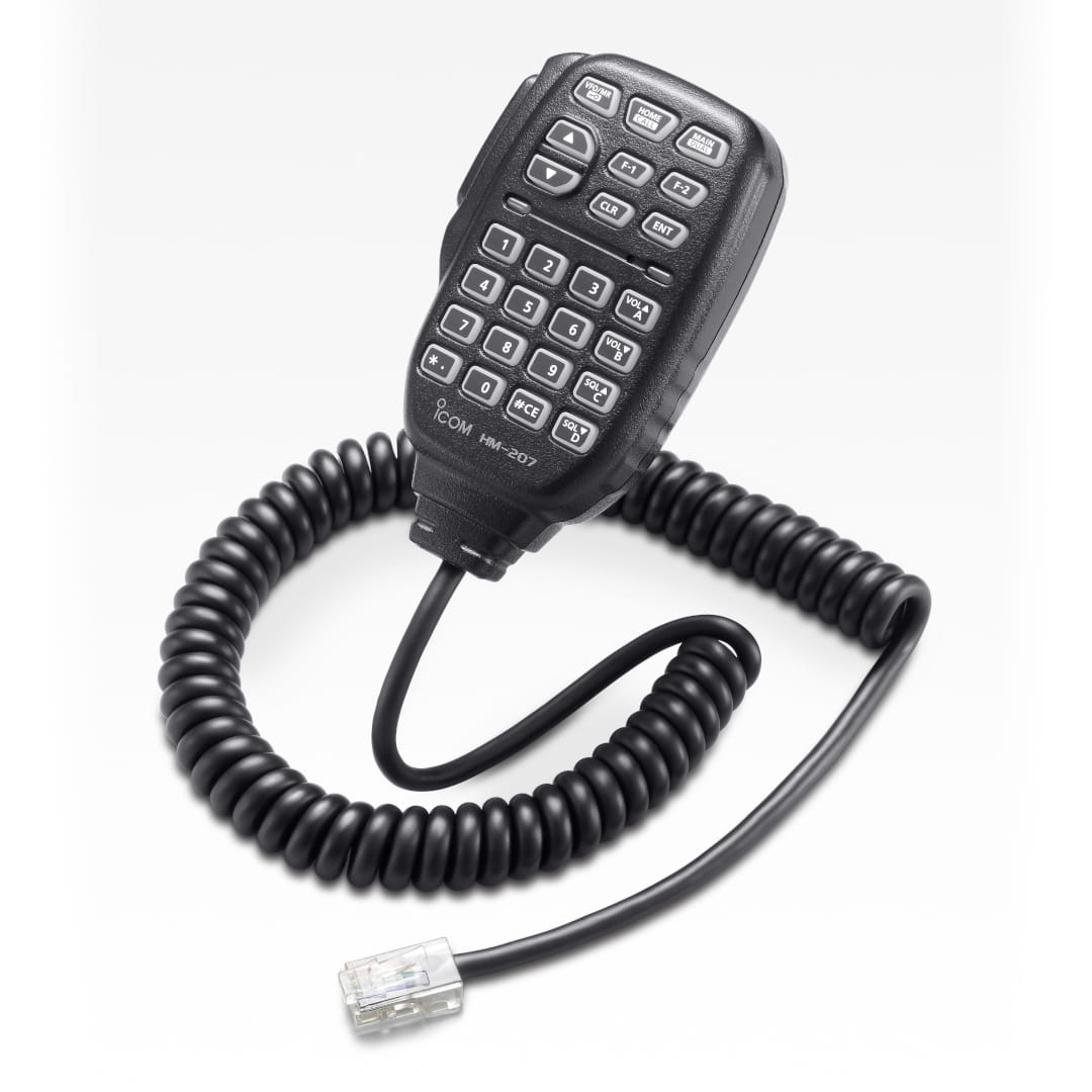 Icom HM-207 to Mikrofon do sterowania radiotelefonami samochodowymi dwuzakresowymi. Posiada możliwość wprowadzania częstotliwości i klawiaturę DTMF.
