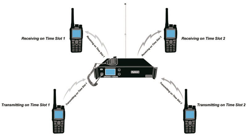 W przypadku łączności cyfrowej DMR, dzięki technologi podziału czasowego TDMA, możliwe jest prowadzenie równolegle dwóch niezależnych rozmów z wykorzystaniem tylko jednej częstotliwości.