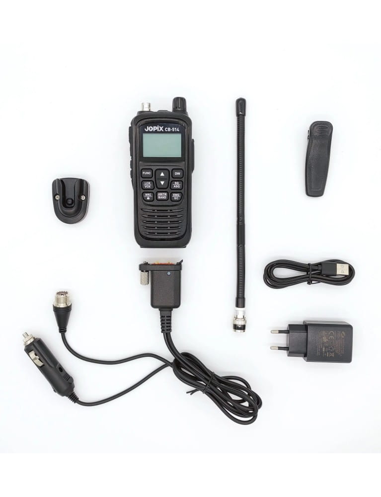 Jopix CB-514 to radiotelefon ręczny 40 kanałowe na pasmo CB. Multistandard umożliwia legalne użytkowanie w wielu krajach Europy. Jopix CB-514 wyposażone jest w automatyczna blokada szumów ASQ, zaawansowany układ redukcji szumów NRC znacznie poprawiający komfort pracy. Posiada gniazdo ładowania USB-C, duży czytelny wyświetlacz LCD, funkcję VOX (komunikacja bez użycia rąk), podwójny nasłuch Dual Watch i sygnał dźwiękowy Roger Beep. Jopix CB-514 wyposażone jest w adapter samochodowy dzięki któremu można podłączyć się pod zewnętrzną antenę CB np. magnetyczną i zasilać urządzenie z gniazda zapalniczki.