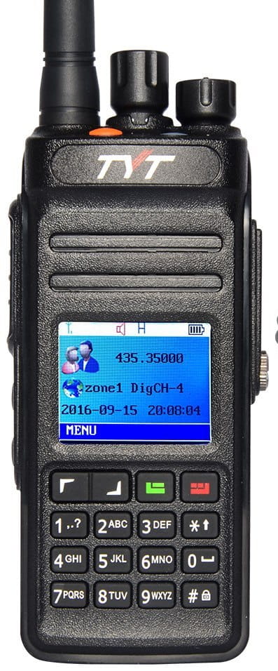Profesjonalny cyfrowy radiotelefon TYT MD-398 PRO pracujący w standardzie DMR (dwa sloty) w paśmie VHF, wodoodporność klasy IP67, wyposażony w kolorowy wyświetlacz i pełną klawiaturę.